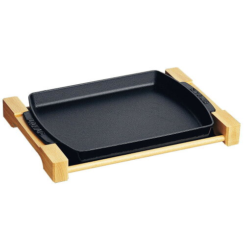 [商品名] ストウブ ステーキプレート 40509-523[素材] 鋳鉄[寸法] 内寸:300 x 200 x H30mm[産地]フランス[ 木枠(外寸):380 x 230 x H40mm 2.0kg ] IH対応 木枠にのせてそのままテーブルに。
